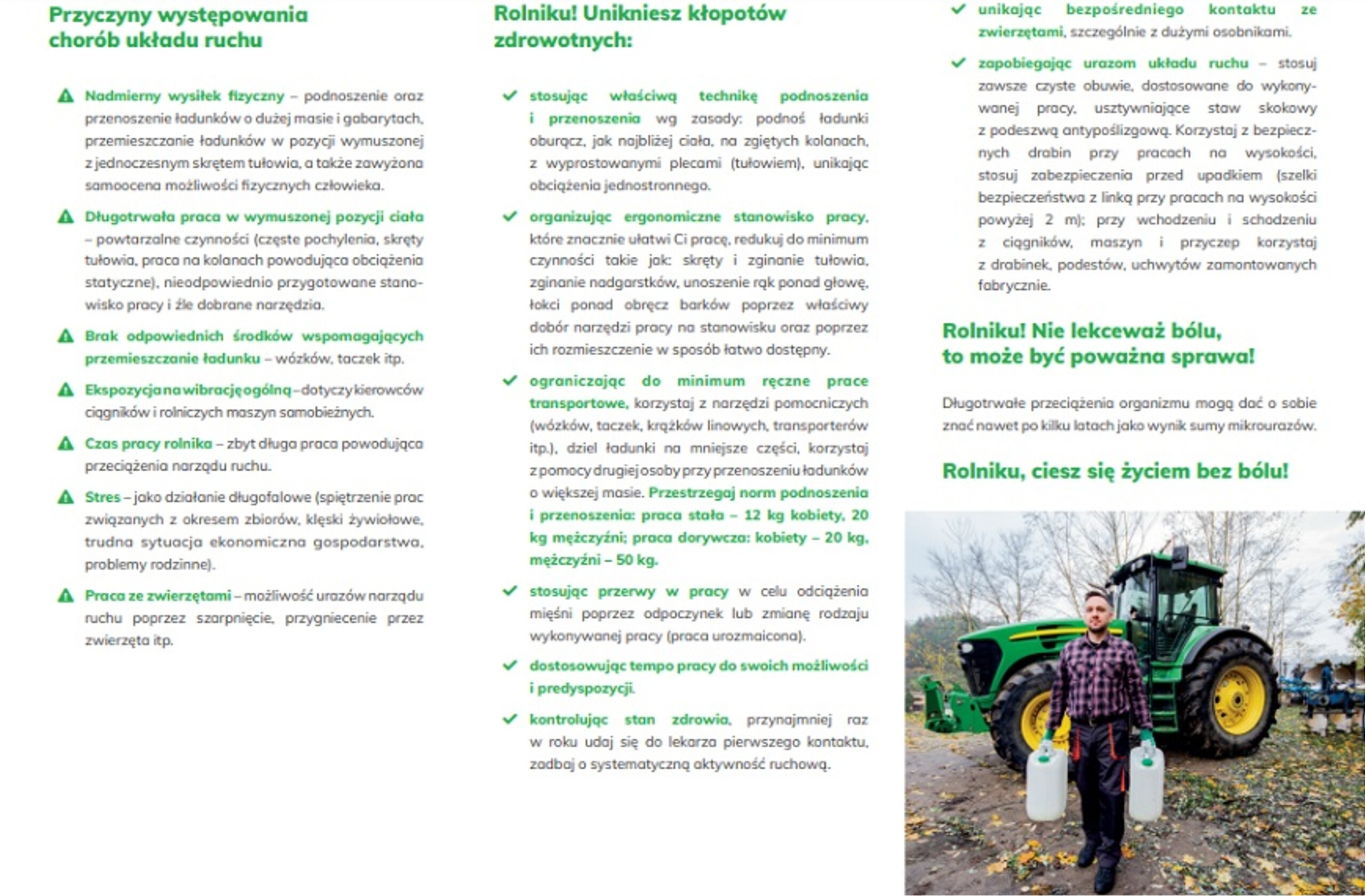 Kości i stawy też rolnika sprawy – to hasło kampanii prewencyjnej Kasy Rolniczego Ubezpieczenia Społecznego, której celem jest zwrócenie uwagi na przyczyny chorób i urazów układu mięśniowo-szkieletowego, które poza dolegliwościami zwiększają ryzyko wypadku przy pracy rolniczej.