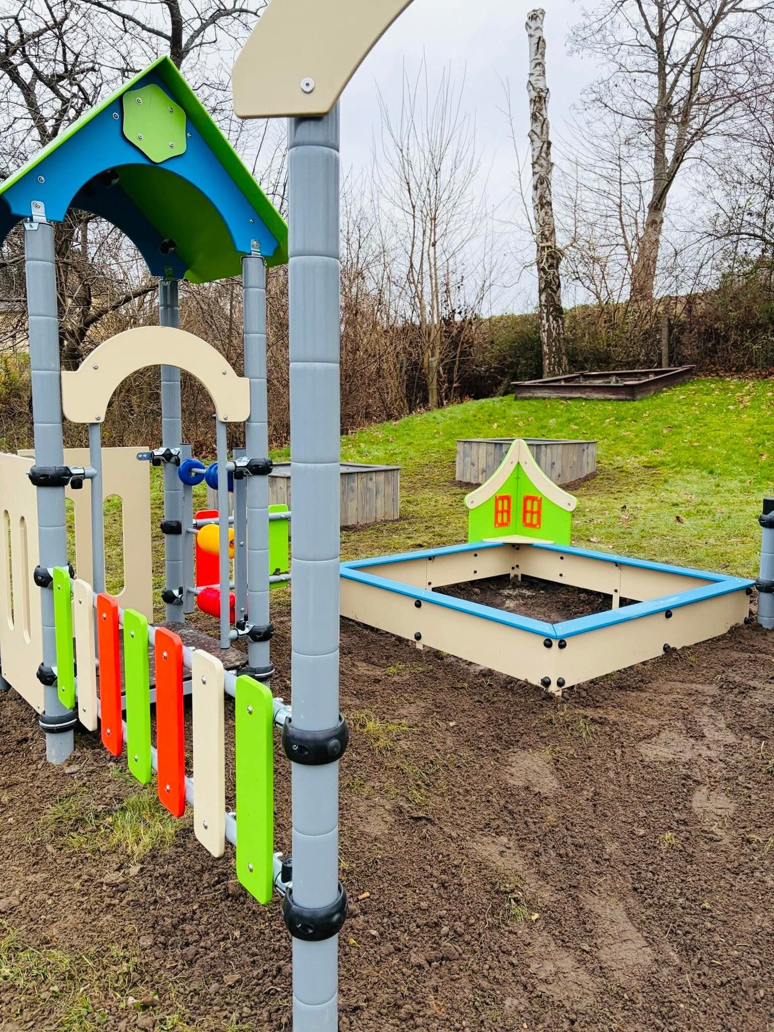 - zamontowanie dużego placu zabaw składającego się z dwóch zestawów, zamontowanie piaskownicy,