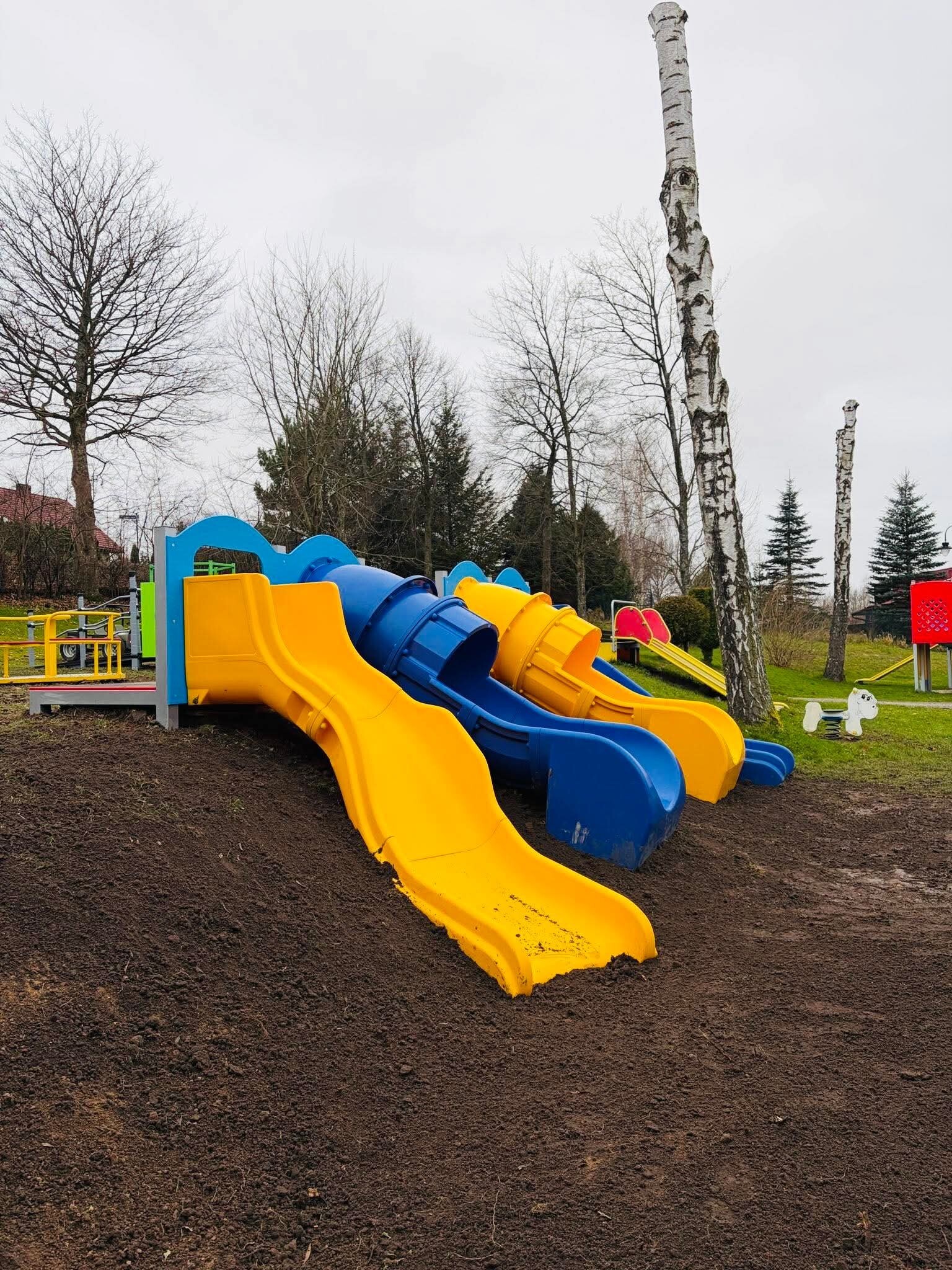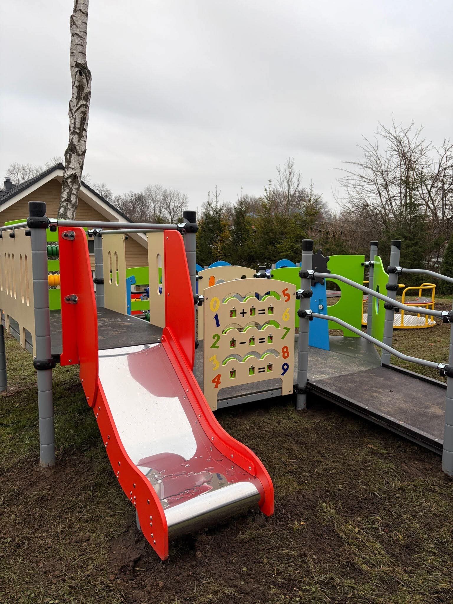 - zamontowane zostały 4 zjeżdżalnie (płaski ślizg 2 szt. i rura zjazdowa zamknięta 2 szt.), karuzela ze stoliczkiem,