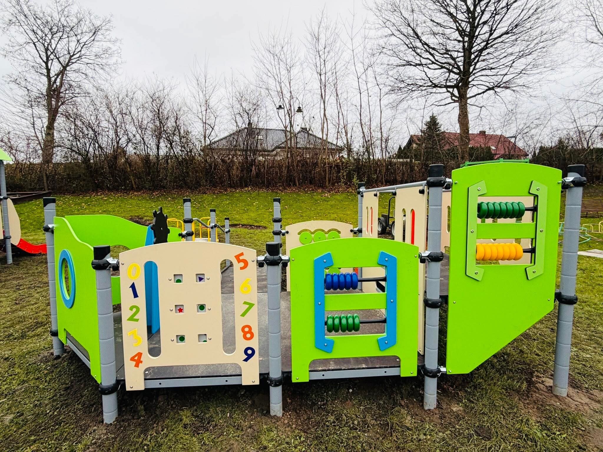 - zamontowanie zestawu zabawowego „Okrąglak", do zabaw sensorycznych, podczas których dzieci będą poznawać różne rodzaje zmysłów.